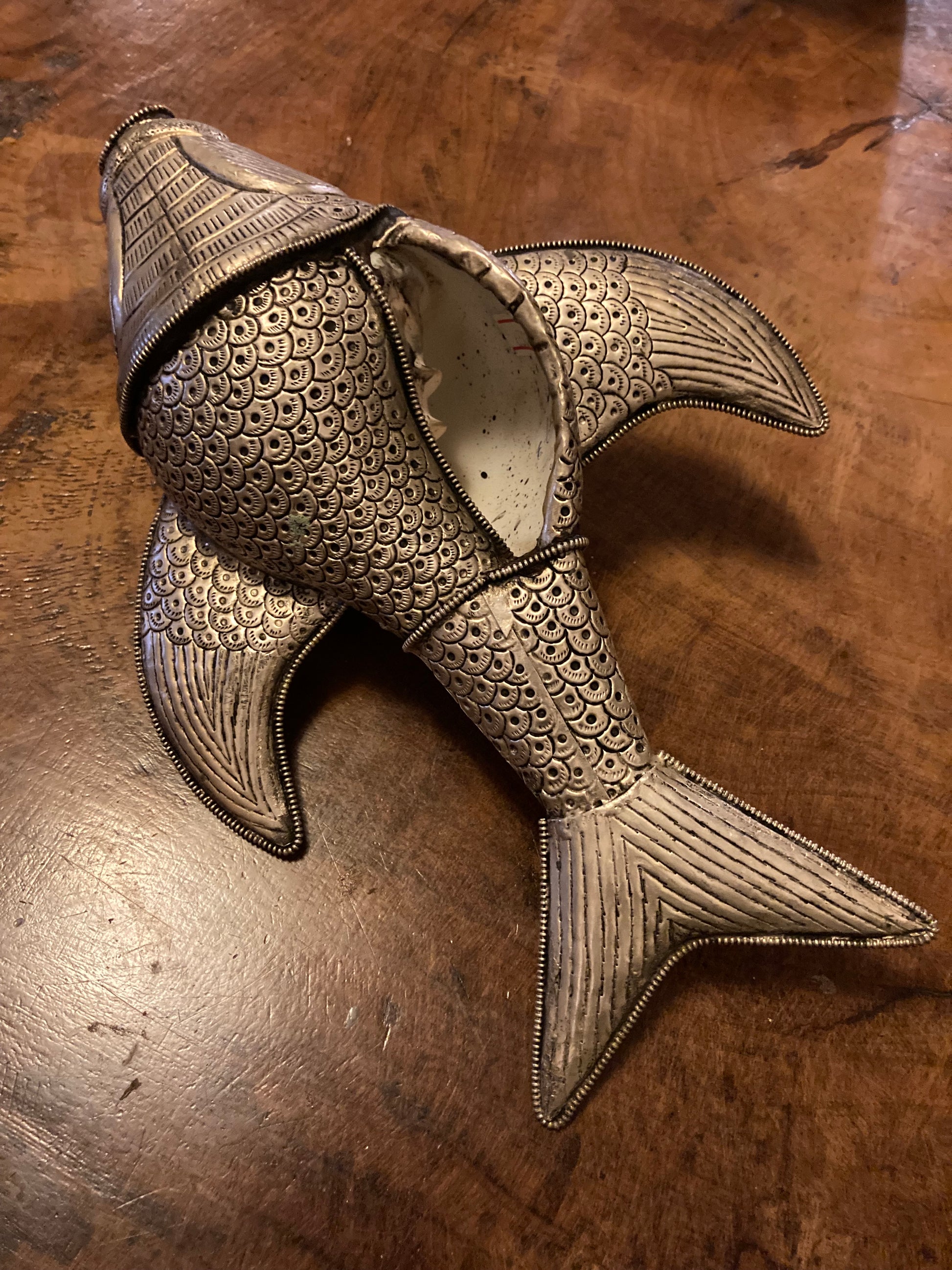Authentieke extra grote visvormige Shankha. Verzilverd en bedekt met turqoise edelstenen. Verbeter uw spirituele reis Verhoog uw heilige ruimte met dit symbool van zuiverheid en bescherming, gemaakt om kosmische energieën en tijdloze schoonheid in uw omgeving te brengen.